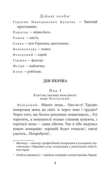 У комедії «Сто тисяч» І. Карпенко-Карий висміює хазяїв, для яких багатство стало метою всього життя, а не засобом для існування. Такі люди ладні продати все на світі, навіть щастя власних дітей, аби тільки збільшувати маєтки. Ганяючись за прибутками, Герасим Калитка стає жертвою шахраїв, що грають на його жадобі та отримують від цього великий визиск.