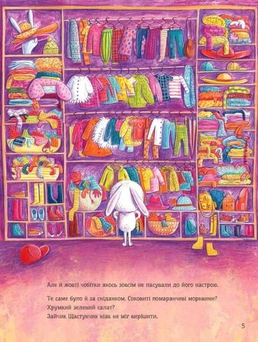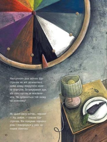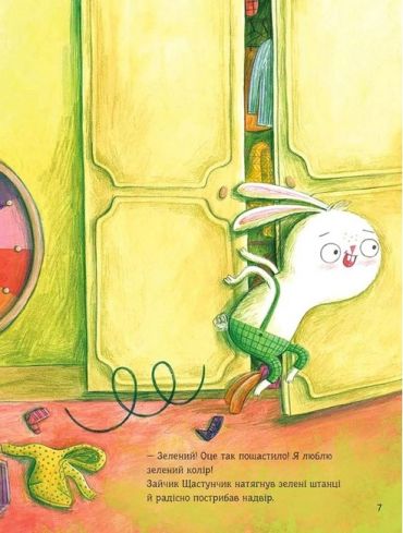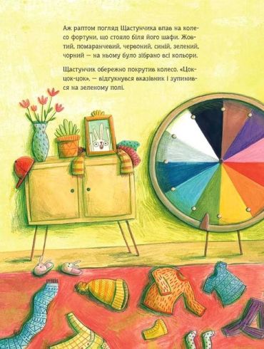 Зайчик Щастунчик зовсім не радий. Щодня йому доводиться вирішувати, що вдягти, з ким гратися й чим поласувати. Тому Щастунчик вигадує, що відтепер ухвалювати всі рішення за нього має колесо фортуни: синій колір на користь синього шалика, лохини на обід і веселощів із павичем. Зелений — на користь зелених штанців, соковитої трави на перекус і стрибків наввипередки з коником. Але чи щасливий тепер Щастунчик? Він чекає, щоб випав помаранчевий! Адже тоді нарешті буде морква й можливість пограти у футбол із білочкою. Раптом Щастунчик усвідомлює, що насправді щасливим його робить… СТРОКАТІСТЬ!
