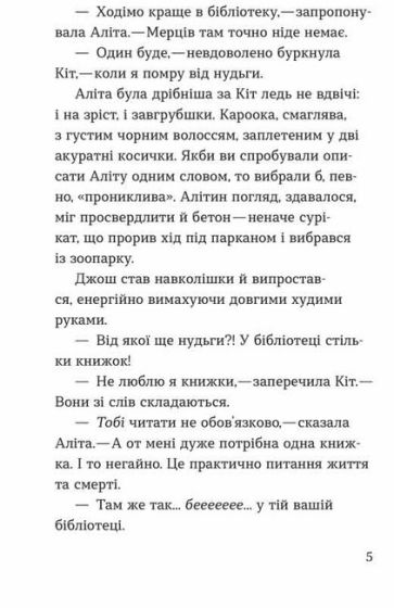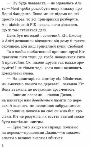 Дівчинка Кіт обожнює гасати надворі, лазити по деревах, бруднити одяг і саму себе. А от сидіти з книжкою — це так нуууууудно… Точно не для неї! Принаймні було. Поки двоє найкращих друзів не затягнули її до звичайної незвичайної бібліотеки, де ростуть книгодерева і мешкають… Цссс! Візьміть до уваги: в бібліотеці не можна галасувати, але інколи можна врятувати світ.