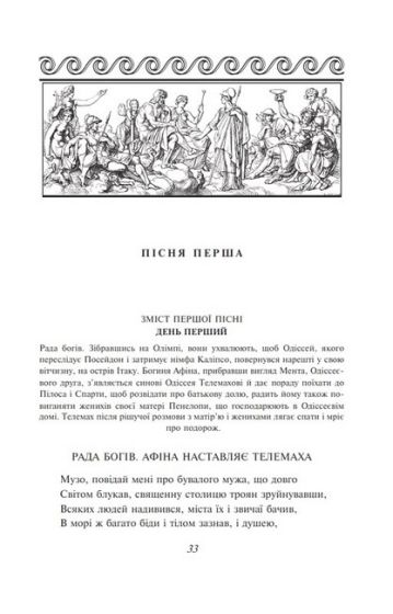 «Одіссея» оповідає про повернення велемудрого Одіссея — одного з героїв Троянської війни — на рідний острів Ітаку, де його чекали дружина Пенелопа та син Телемах, про незвичайні пригоди, які довелося пережити Одіссею на шляху додому, та про реальні та фантастичні землі, де він побував. Поема змальовує цікаві побутово-звичаєві картини із життя стародавніх еллінів і разом з тим вводить читачів у казково-фантастичний світ грецької міфології. «Одіссея» дихає урочистим спокоєм і, сповнена духовної краси і величі, є завершеним втіленням класичної епопеї.