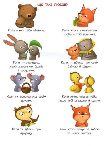 Ви тримаєте в руках не просто книгу, а посібник, який допоможе вам розповісти малюкові про те, що таке любові дружба. Виявляти любов, дарувати любов, оточувати любов’ю – усьому цьому потрібно вчитися з малих років. Казки про звірят, вірші й завдання допоможуть малюкові зрозуміти значення слів "любов" і "дружба". Вони розкажуть, як піклуватися про близьких, як будувати стосунки з рідними й однолітками, як стати чуйним і турботливим сином або дочкою,братом або сестрою,другом або подругою,як любити природу, братів наших менших і весь світ.