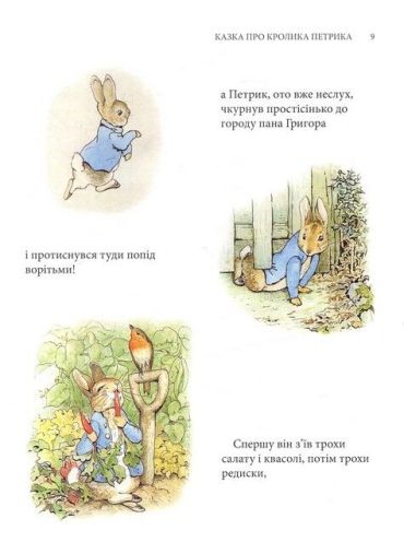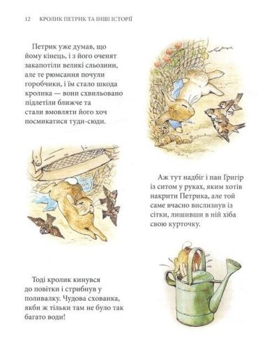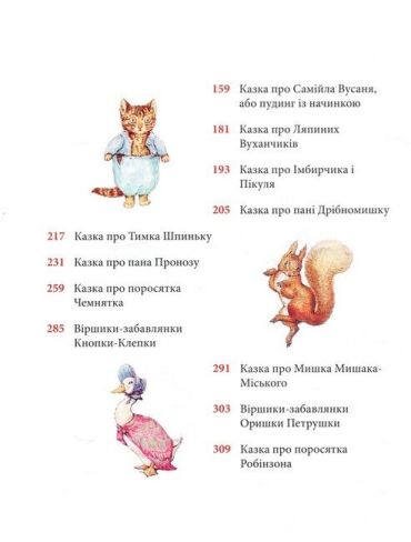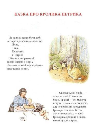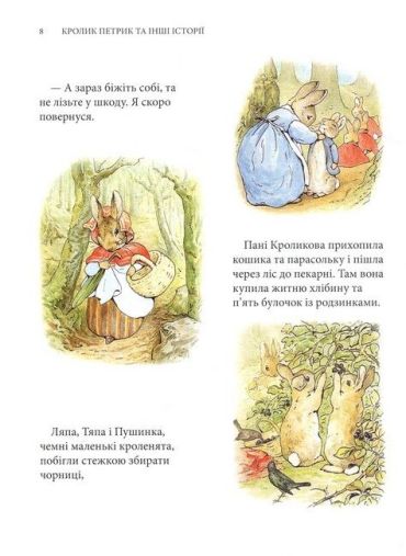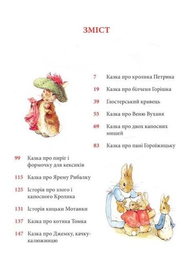 Кролик Петрик, його двоюрідний братик Веня Вухань, білченя Горішок, жабун Ярема Рибалка, качка-калюжниця Джемка… Ці та інші персонажі казок Беатрікс Поттер (1866–1943), англійської дитячої письменниці й малярки, вже давно стали улюбленими книжковими героями маленьких британців, а також дітей усього світу. Рідкісна спостережливість і багата уява авторки дали їй змогу створити напрочуд вдало стилізовані й зворушливо олюднені oбрази звірят. Її маленькі герої не завжди слухаються старших, часто-густо встрявають у різні халепи — і все-таки щасливо з них виплутуються, часом вирушають у мандри і, безперечно, мудрішають, — а деякі, переходячи з казки в казку, навіть дорослішають на наших очах і створюють власні родини. Зібрані в цьому виданні 23 прижиттєво опубліковані книжечки Беатрікс Поттер в українському перекладі — довгоочікувана перша зустріч українських дітей з творчістю видатної англійки.