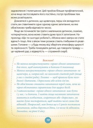 Спираючись на цей практичний посібник, можна навчити дитину говорити правду, бути наполегливою і цілеспрямованою, прищеплювати їй любов до книг без нотацій, моралей, криків, сварок, а за допомогою гри і казки.