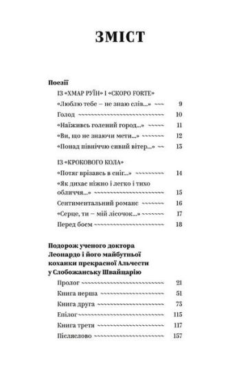 До збірки увійшли: «Подорож ученого доктора Леонардо і його майбутньої коханки прекрасної Альчести у Слобожанську Швайцарію», вибрані вірші.