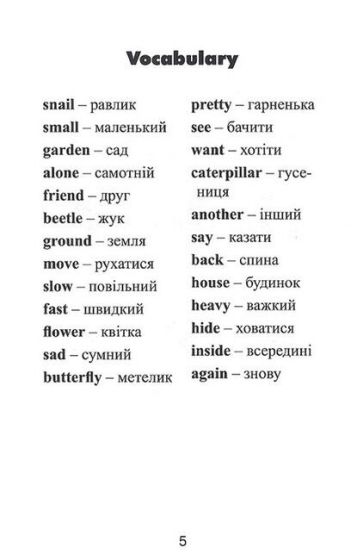 Ця книга містить цікаві історії про равлика, написані нашою співвітчизницею Маріаною Рудницькою для дітей молодшого шкільного віку. Збірка відкриє маленьким читачам дивовижний світ тварин та познайомить з мешканцями саду. Читання її англійською мовою буде не тільки цікавим, але й корисним. Вона допоможе легко і просто засвоїти новий матеріал та застосувати свої знання на практиці. Текст супроводжується системою вправ, метою яких є перевірити розуміння змісту прочитаного, відпрацювати та закріпити лексику й граматичні конструкції, сприяти розвитку мовленнєвих навичок і творчих здібностей у дітей. Вправи розроблено з урахуванням сучасних вимог методики викладання іноземних мов. До книги додаються підсумковий тест і англо-український словник.