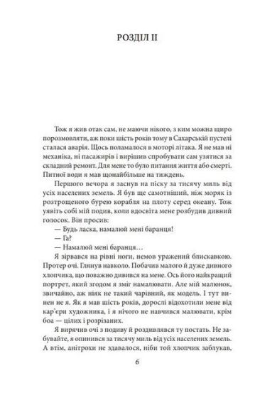 Твори відомого французького письменника, поета, професійного льотчика Антуана де Сент-Екзюпері (1900—1944) раз у раз привертають увагу сучасного читача. «Маленький принц» (1943) — найвідоміший його твір — став підсумком життєвого досвіду письменника. Ця мудра і людяна казка-притча просто і проникливо розповідає про найважливіше — про дружбу і любов, про красу і нетерпимість до зла. Читаючи її, почуваєшся дитиною і починаєш дивитися на навколишній світ зовсім іншими очима. «Усі ми родом з дитинства», — нагадує Сент-Екзюпері, знайомлячи читачів з Маленьким принцом — найзагадковішим і найзворушливішим героєм світової літератури.