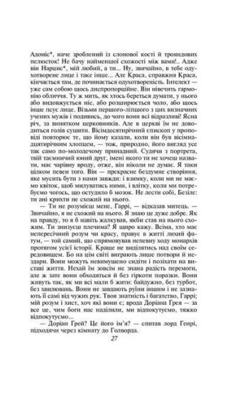 Єдиний роман письменника — «Портрет Доріана Ґрея», створений у рекордно короткий термін — за три тижні, приніс авторовi карколомний успіх і скандальну славу. Головний герой — юнак, наділений неймовірною красою. Милуючись своїм портретом, Доріан висловлює бажання, щоб портрет старів, а він завжди залишався молодим. З того самого часу жодної зморшки не з’являлося на вічно юному обличчі джентльмена Ґрея, який жив у пороці й розпусті. Всі його злочини відкладали відбиток лише на його портреті, який з кожним днем ставав усе гірше, старів і вмирав. Але за все треба платити...
