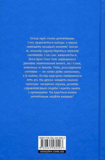 Остап мріє стати детективом. І ось трапляється нагода: у школі зникають козацькі монети! Звісно ж, хлопець одразу береться шукати злочинців. І не сам: виявляється, його брат Олег теж зацікавився дивним зникненням монет, як і Соня, новенька зі школи. Утім, розслідувати злочини — не лише дуже захопливо, а й важко, бо під підозрою опиняються геть усі. На друзів чекають шалені пригоди: загадкові справи, допити, справжнісінькі скарби і навіть замки з привидами. Чи вдасться юним детективам знайти винних?