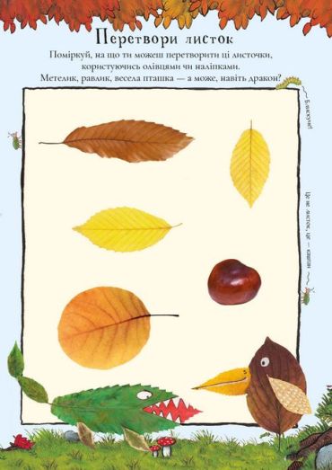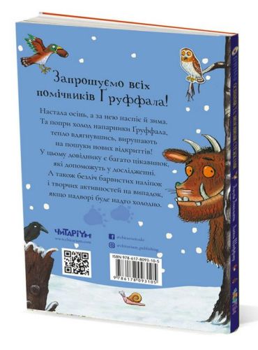 Запрошуємо всіх помічників Ґруффала! Настала осінь, а за нею наспіє й зима. Та попри холод напарники Ґруффала, тепло вдягнувшись, вирушають на пошуки нових відкриттів! У цьому довіднику є багато цікавинок, які допоможуть у дослідженні. А також безліч барвистих наліпок і творчих активностей на випадок, якщо надворі буде надто холодно.