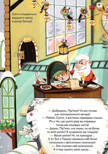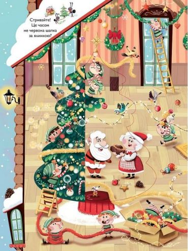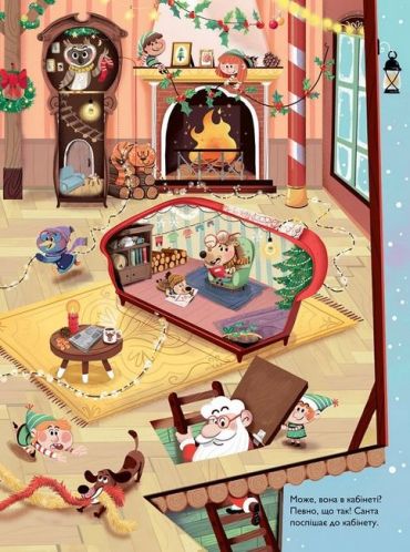 Чудова книжка з віконцями, за якими ховаються сюрпризи будинку Санти.Гайда разом із ним шукати шапку!