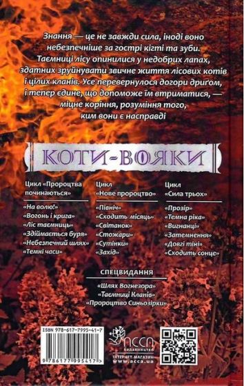 П'ята книга третього циклу «Сила трьох» серії світового бестселера «Коти-вояки».Довгі тіні таємниці, яка потрапила в лапи чужинця, затулили сяйво зоряних предків на Срібносмузі. Невже коти настільки сліпі, що довіряться зайді й втратять віру в Зореклан? Троє обраних намагаються відкрити очі Тіньовим воякам і повернути їх до вояцького правильника, але вони навіть не підозрюють, що найбільше для них зло зачаїлося у власному клані. Жага помсти за давню образу от-от переросте у полум’я, здатне зруйнувати долі багатьох Громових котів.