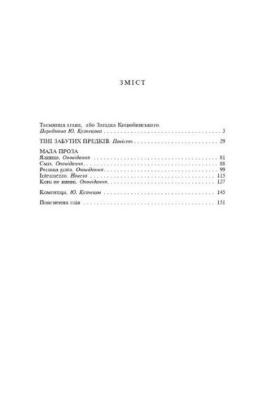 До видання увійшли кращі твори талановитого українського письменника, блискучого новеліста, послідовника І. Франка, майстра слова Михайла Коцюбинського (1864—1913) — «Тіні забутих предків», «Коні не винні», «Intermezzo», «Сміх» та інші. Невеликі за обсягом, проте психологічно напружені твори, в яких письменник зобразив живі й правдиві образи, належать до найвищих досягнень української класичної прози.