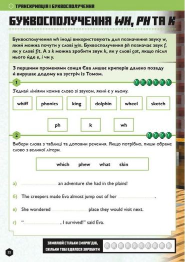 Ваша дитина вирушить у кілька пригод дивовижним світом Minecraft, вдосконалюючи знання англійської мови в процесі. Вирушайте у пригоду світом Minecraft завдяки посібнику! Ігрові персонажі, Том і Єва, які зустрінуться читачеві на сторінках посібника, виконують непрості місії і відважно шукають скарби... повсякчас відбиваючись від надокучливих мобів!