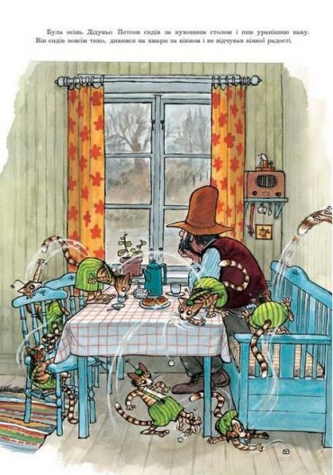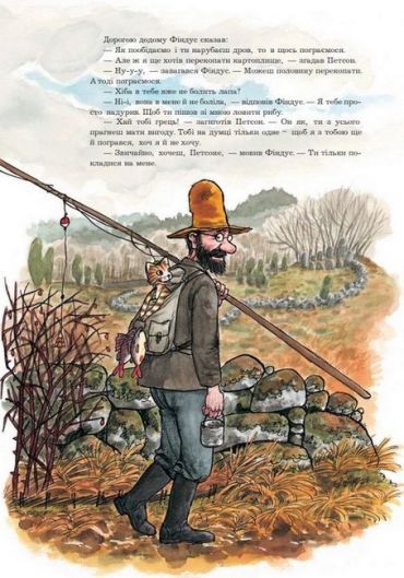 Кіт Фіндус витріщає на дідуня Петсона очі. Таким сердитим він його, певно, ще ніколи не бачив. «Я маю щось придумати, щоб розважити його», — думає Фіндус. — Може, підемо ловити рибу? — питає він. — Тобі знов стане весело.