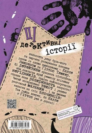 Ці детективні історії захоплять уяву будь-кого та змусять розкривати злочини разом із двома детективами — Калле Нишпером та Ґіттою Тямкер. Вони працюють цілодобово, аби покласти край ремеслу всіляких негідників. Навіть найзаплутаніші справи вони розкривають запросто! Читаючи книжку, пильнуйте: тут повно шахрайських хитрощів! Тільки той, хто зосереджено читатиме текст і уважно розглядатиме малюнки, зможе напасти на слід злочинців. Тож гайда вперед, бо детективи вже в дорозі!