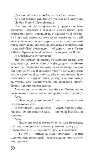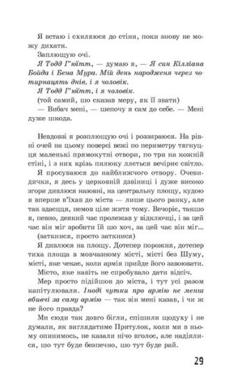 Цього міста не знайдеш на жодній мапі, в жодному туристичному путівнику. Прентісстаун — унікальне місто на планеті Новий Світ, де після епідемії Шуму люди змушені читати думки одне одного. Усі, крім мера, або, як він себе називає, «президента Прентісса». Обманом і шантажем він заволодів владою і позбавив населення усіх прав. Чотирнадцятирічний Тодд Г’юїтт, до нестями закоханий у Віолу, перебуває в ув’язненні у свого найлютішого ворога й нічого не знає про долю дівчини. А тим часом у місті з’являється таємнича організація, готова чинити опір свавіллю Прентісса…