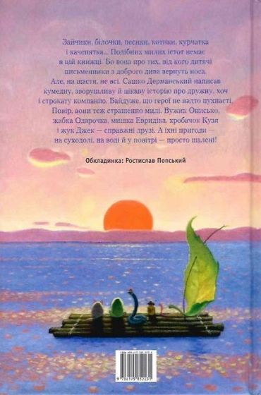 Зайчики, білочки, песики, котики, курчатка і каченятка… Подібних милих істот немає в цій книжці. Бо вона про тих, від кого дитячі письменники з доброго дива вернуть носа. Але, на щастя, не всі. Сашко Дерманський написав кумедну, зворушливу й цікаву історію про дружну, хоч і строкату компанію. Байдуже, що герої не надто пухнасті. Повір, вони теж страшенно милі. Вужик Онисько, жабка Одарочка, мишка Евридіка, хробачок Кузя і жук Джек — справжні друзі. А їхні пригоди — на суходолі, на воді й у повітрі — просто шалені!