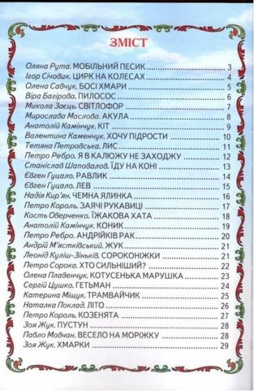До збірки увійшли вірші відомих українських письменників про тварин, про правила поведінки та спілкуваня, про речі, що нас оточують, тощо.