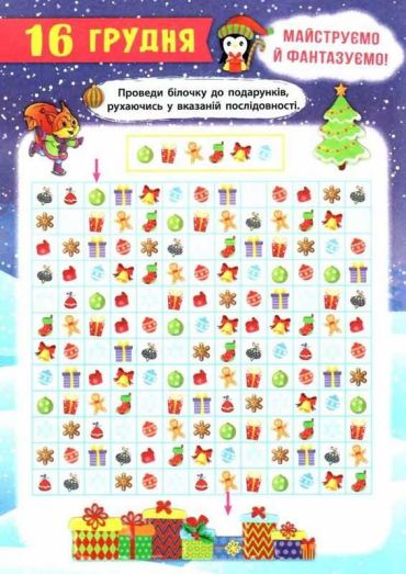 - захопливі розвивальні й творчі завдання на кожен день, які допоможуть малюку підготуватися до свята, створити новорічний настрій і поєднувати гру з навчанням ;