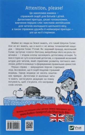 Майже всі люди на Землі знають, хто такий Шерлок Голмс. Але не всі знають, що в нього є не менш талановитий нащадок — Шерлок Голмс П’ятий. Як і відомий пращур, маленький Голмс зустрічає «свого» Ватсона, випробовує його на роль помічника — і згодом хлопці засновують детективну агенцію. Та їхня історія не суто класичний детектив, а справжній мозковий штурм для читачів, який сприятиме розвитку логічного мислення, роботі в команді та формуванню правильних цінностей.