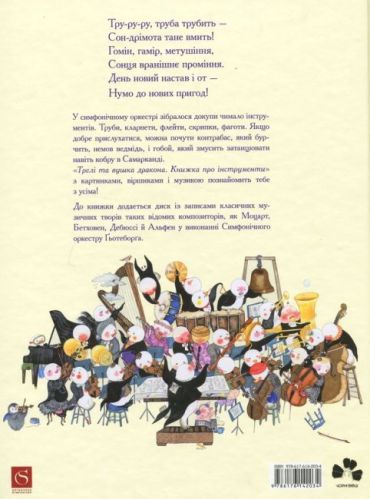 Книжка для справжніх естетів - дітей та їхніх батьків, бабусь, дідусів, тітоньок та дядечків, братів, сестер, вихователів, вчителів. Книжка про музику і з музикою. Весь навколишній світ наповнений музикою, музичними асоціаціями. Саме це і спробували якомога повніше і в доступній формі розповісти-донести дітям шведський письменник Леннарт Гельсінґ, ілюстратор Ане Ґуставссон та Ґьотеборзький симфонічний оркестр, Шведський симфонічний оркестр з чудовим диригентом Юганессом Ґуставссоном. А переклад для українських читачів здійснила Наталя Іваничук, мова якої - це також завжди прекрасна мелодія; у вишукану віршовану форму тексти увібрала поетеса і перекладачка Галина Крук, вірші легко запам'ятати і навіть хочеться наспівувати.