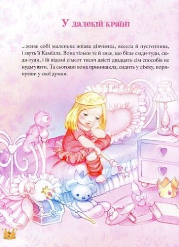 Майже кожна дівчинка мріє бути принцесою.Прагне цього й маленька Камілла.Однак для досягнення мети вона має повірити у свої сили.А допоможе їй у цьому й надихатиме історіями про чарівних,рішучих і добрих принцес хамелеон Клементіно.Разом із героями книжки читачі поринуть у магічний світ Неозорого Саду та Королівства Моря,відвідають країну вогнедишних драконів і гомінких зірок.А щоб розважитись і віднайти власні таланти,намалюють портрет і неймовірний замок,розгадають загадки та складуть вірша про найчарівніших принцес на світі-про самих себе.