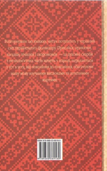 Відкривши цю книжку, ти потрапиш у чарівний світ українського фольклору. Прислів’я, приказки, загадки, лічилки і скоромовки – ці духовні скарби з незапам’ятних часів живуть у народі, передаються з уст в уста, від покоління до покоління, збагачуючи нашу мову влучними висловами та дотепними жартами.