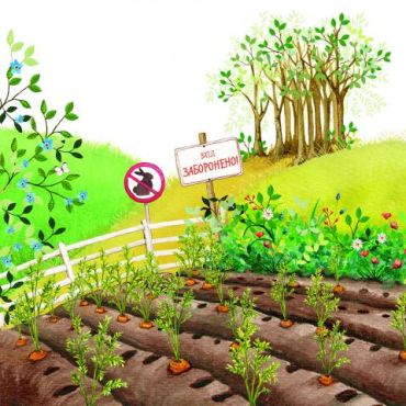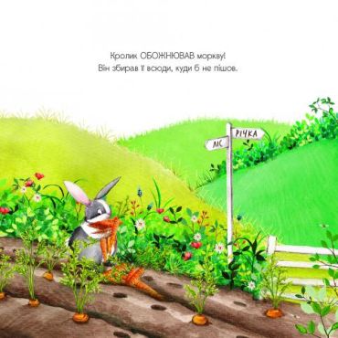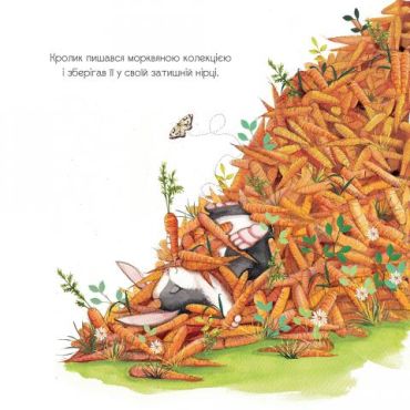 Він зносить її до своєї норі, аж доки там не залишається місця і для нього самого. Друзі гостинно кличуть його пожити в собі, но Кролик скрізь тягне за собою моркву! Тож хатка-панцир Черепахи, і гніздо Пташки, і хатка Бобра, і нірка Білочки не витримують морквяної навали — і руйнуються. Що ж тепер робити бідолашним звірятам?..