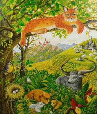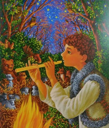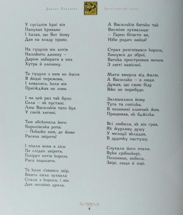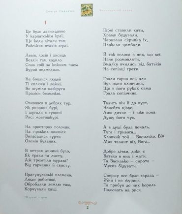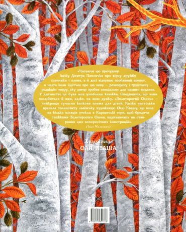 Читаючи цю пречудову казку Дмитра Павличка про вірну дружбу хлопчика і оленя, я й досі відчуваю особливий трепет, а надто коли йдеться про цю нову – розширену і ґрунтовну – редакцію твору, яку автор зробив спеціально для нашого видання. У дитинстві це була моя улюблена книжка. Сподіваюся, що вона полюбиться й вам, адже, на мою думку, «Золоторогий Олень» — найкраща сучасна казкова поема для дітей. Поетична казка настільки вразила талановиту львівську художницю Олю Квашу, що вона на кілька місяців утекла в Карпатські гори, щоб бродити стежками Золоторогого Оленя, надихаючись на створення цих непересічних ілюстрацій, намальованих у двох різних техніках, одна з яких філігранно імітує традиційні гуцульські кахлі».