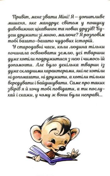 Привіт, мене звати Міні! Я - допитливе мишеня, яке мандрує світом у пошуку дивовижних цікавинок та нових друзів! Будеш дружити зі мною, малюче? Я розповім тобі багато-багато чудових історій. У стародавні часи, коли людина тільки починала освоювати землю, усі тварини дуже хотіли подружитися з нею і чимось їй допомогти. Але було декілька тварин із дуже складними характерами , які не хотіли ні допомагати, ні дружити, а хотіли тільки вередувати і байдикувати. Саме про таких звірів я й хочу тобі повідати, а ти послухай і скажи, у чому ж вони були неправі...