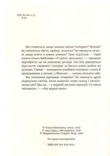 Троє підлітків – герої книги Ольги Войтенко «У світлі світляків» – змушені перевірити це на власному досвіді. Єві-Лізі доведеться відкласти планшет і вперше за багато років вийти на вулицю, Тімові – полишити улюблені книжки і стати її провідником у пітьмі, а Максові – заново шукати себе.