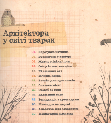 Задовго до того, як люди навчилися будувати собі житло, у природі вже існували неймовірні споруди й талановиті майстри. У цій книзі ви дізнаєтеся про 14 досконалих проектів, здійснених тваринами-архітекторами. Це надихне маленьких читачів та їхніх батьків по-новому, уважніше поглянути на світ архітектури навколо нас — і природної, людської.
