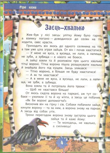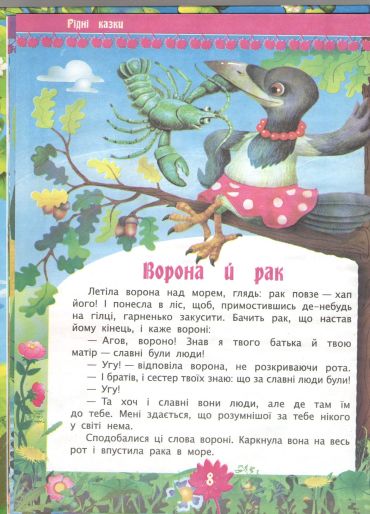 "Рідні казки". 64 сторінки. Формат 60х90 1/8 (А4). Опт і роздріб. Забавні і веселі, іронічні і тонкі, ці казки пронизані багатовіковою мудрістю нашого народу. Читаючи дитині про витівки хитрої лисички, поневіряння жадібного вовка, вигадках витівника Шабарши, ви прищепите йому любов до рідного слова, навчіть з гумором ставитися до будь-яких життєвих ситуацій. Ваш рідний маленький людина побачить, що хитрість і підступність бувають наказны по заслугах, а дружба і взаємовиручка завжди повертаються добром. Найменші читачі будуть з задоволенням розглядати яскраві веселі картинки, зроблені з любов'ю і старанням. А хлопцям постарше буде легко читати наші казки, тому що вони надруковані великим і чітким шрифтом. У збірник зібрані такі казки : "Пузир, соломинка та личак", "Заєць-хвалько", "Журавель та чапля", "Ворона й рак", "Як лисиця вчилася літати", "Лисиця й тетерів", "Бобове зернятко", "Зимівля звірів", "Лев і ведмідь", "Лисиця і рак", "Коток - сірий лобок, козел та баран", "Лисиця та цап", "Вівця, лисиця та вовк", "Коза-дереза", "Ведмідь та собака", "Курочка, ведмедик та тетерів", "Кіт та лисиця", "Шабарша". Приємного вам читання.