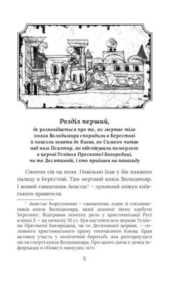 Вдумливий, спостережливий та небайдужий до всього, що діється навколо, мандрівник і книжник Симеон разом зі своїми друзями та випадковими знайомими, серед яких — реальні історичні особи й вигадані персонажі, відкриває для себе й читачів водночас знайомі та невідомі епізоди середньовічної історії Української держави. На сторінках роману він захопливо розповідає про місця, які відвідує, та ситуації, свідком чи учасником яких стає. Які пристрасті вирують навколо княжого престолу після смерті Володимира Святославича? Які інтриги плетуть зацікавлені сторони? На що готовий піти кожен з учасників цих перипетій?