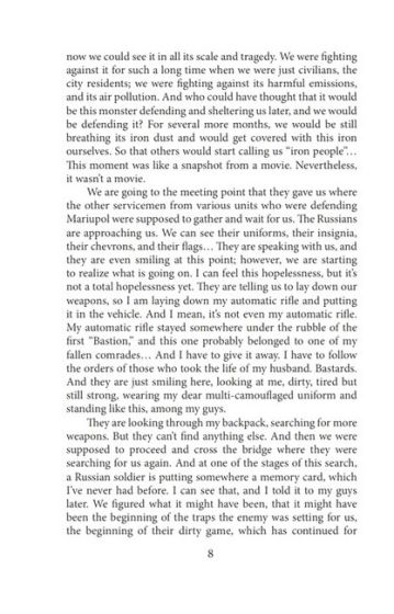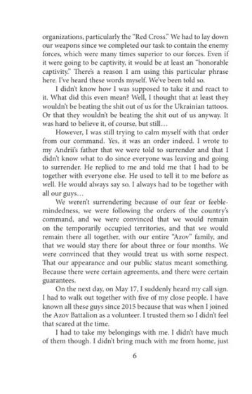 For 86 days, the Ukrainian military held defenses in the surrounded Mariupol and on the territory of the Azovstal plant. In order to preserve the lives of the soldiers and save the wounded, the defenders—by order of the higher military command—stopped standing on the defensive, left the territory of the plant and were to surrender to the so-called "honorable captivity" in the presence of international organizations and observers, with the condition of exchange within 3-4 months. Valeriya "Nava" Subotina was part of the press service of the "Azov" regiment. She was enforced to stay in captivity—first in Olenivka, then in Taganrog prison—for over 11 months. In this book, Valeriya described all the circles of hell that she went through for almost a year. Constant surveillance, control, humiliation, inhumane conditions of detention, critical shortage of food and water, attempts of the enemy to break her physically and morally, subjugate her, intimidate her, and push her to treason—Valeriya had to experience all these. Interrogations and torture were exhausting. The impossibility of getting in touch with friends and relatives, misinformation and enemy propaganda would take away the last hope for exchange and freedom. Nevertheless, captivity did not break the intrepid woman; now she is a witness to the crimes of the Russian Federation.