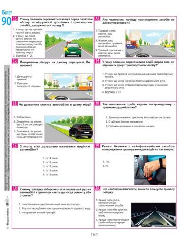 У книзі у вигляді білетів подано екзаменаційні питання, затверджені наказом Головного сервісного центру МВС України № 3 від 10.01.2024 р. «Про затвердження Змін до тестових питань до екзаменаційних білетів для складання теоретичного іспиту для отримання права на керування транспортними засобами відповідної категорії». У ній зібрано питання, що стосуються кандидатів у водії транспортних засобів категорій «А1» (мопеди, скутери), «А» (мотоцикли), «В» (легкові автомобілі), «ВЕ» (легкові автомобілі з причепом), «С1», «С» (вантажні автомобілі), «С1Е», «СЕ» (вантажні автомобілі з причепом). Для категорій «А1» та «А» окремо сформовано 10 білетів по 10 запитань, а для категорій «С1», «С», «С1Е», «СЕ» — 25 білетів по 10 запитань.