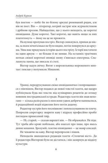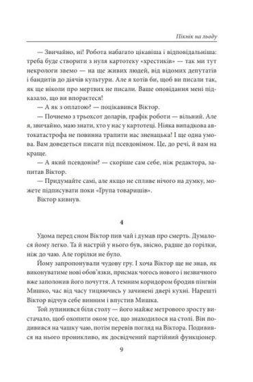 Андрій Курков — перший український автор, чий твір «Пікнік на льоду» потрапив в десятку найцікавіших європейських бестселерів. Головний герой роману — журналіст Віктор Золотарьов — отримує незвичайне завдання від провідної газети: писати некрологи про впливових людей, які поки що живі.