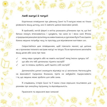 Оповідання про дівчинку Санні та її родину створювалось не тільки для того, щоб розважити малечу. В доступній формі воно порушує важливе питання емоційної підтримки близьких. Для батьків та їхніх діточок ця історія стане приводом поговорити про втому й сум, як реакцію організму на навантаження, про потребу людини в часі та особистому просторі, а також про відповідальність кожного за власну «батарейку».