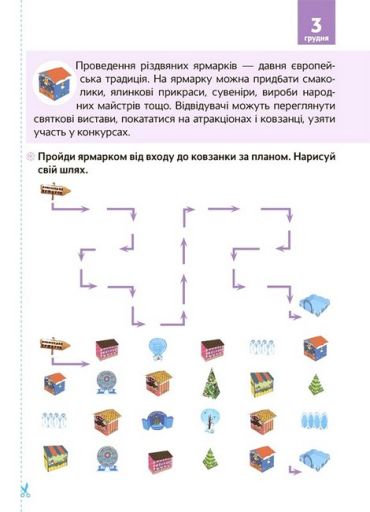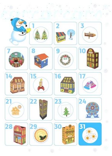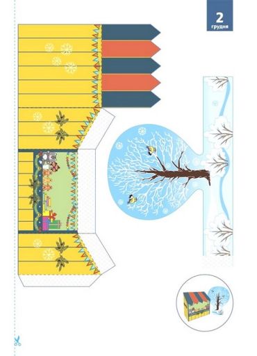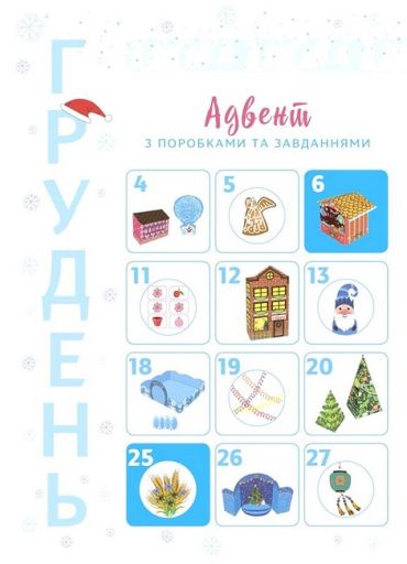 Перед вами — простір для творчості для дітей, побудований за принципом адвент-календаря. На його сторінках на дітей чекають 15 поробок та 15 завдань на кожен день очікування зимового свята. Кожна поробка перетворюється на макет будиночку, які складаються у прикрасу для оселі в вигляді святкового ярмарку. Наш творчий адвент-календар допоможе організувати сумісне родинне дозвілля та перетворити очікування свят на справжню зимову пригоду!