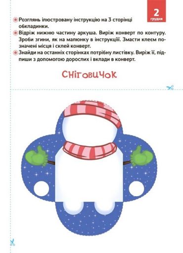 Перед вами — простір для творчості для дітей, побудований за принципом адвент-видання. На його сторінках на дітей чекають 13 саморобок та 18 завдань на кожен день очікування зимових свят. Кожна саморобка перетворюється на конверт, у який потім можна покласти святкову листівку та привітати найрідніших!