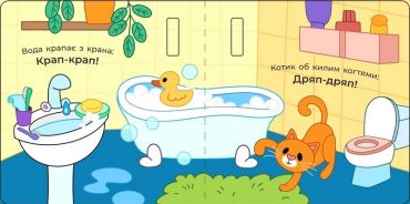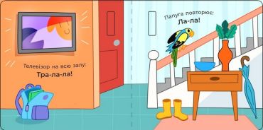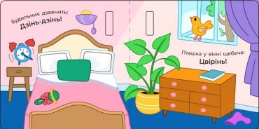 Чергова книжка серії познайомить зі звуками, які малеча чує в оселі: «Мама цілує доню: цьом-цьом! Годинник вибиває: бом-бом-бом!».