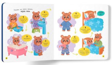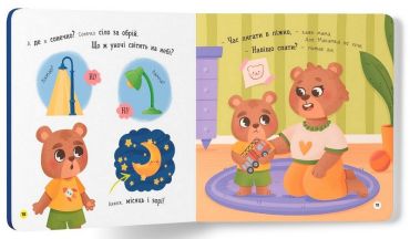 Ця інтерактивна книжка підкаже батькам, як в ігровій формі допомогти дитині навчитися самостійно лягати в ліжко і засинати без вередувань. Разом з милим героєм ваш малюк засвоюватиме важливі навички: запам’ятає правильну послідовність дій — покласти іграшки на місця, покупатися, відвідати горщик, одягти піжамку, лягти в ліжечко, заплющити оченятка. А якщо раптом не вийде з першого разу — не варто засмучуватися, треба зробити цей процес щоденним ритуалом. Також малюк дізнається, навіщо відпочивати вночі, і як це роблять тваринки та комашки.