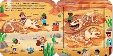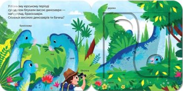 Маленькі допитливі читачі подорожуватимуть багатьма картинками на тему динозаврів, включно з музейними експонатами, природними місцями існування юрського періоду та місцями активних розкопок динозаврів.