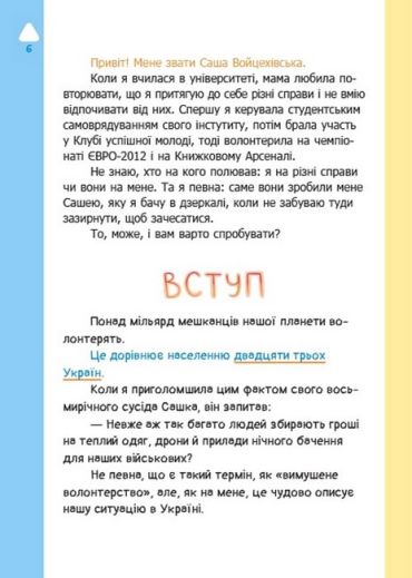 Авторка Саша Войцехівська легко та глибоко пояснює, хто такі волонтери і які цінності та навички потрібні для цього виду роботи. Вона також розповідає про те, як кожна дитина може стати частиною позитивних змін у світі через власну активну участь. Ця книга надихає юних читачів на дії та допомагає їм розуміти, що навіть маленькі кроки можуть мати велике значення для інших і для світу в цілому.