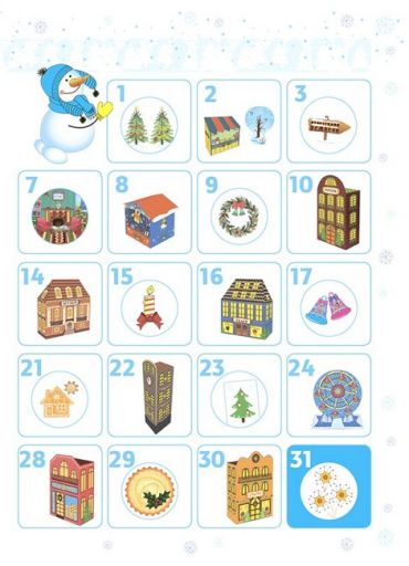 Перед вами — простір для творчості для дітей, побудований за принципом адвент-календаря. На його сторінках на дітей чекають 15 поробок та 15 завдань на кожен день очікування зимового свята. Кожна поробка перетворюється на макет будиночку, які складаються у прикрасу для оселі в вигляді святкового ярмарку. Наш творчий адвент-календар допоможе організувати сумісне родинне дозвілля та перетворити очікування свят на справжню зимову пригоду!