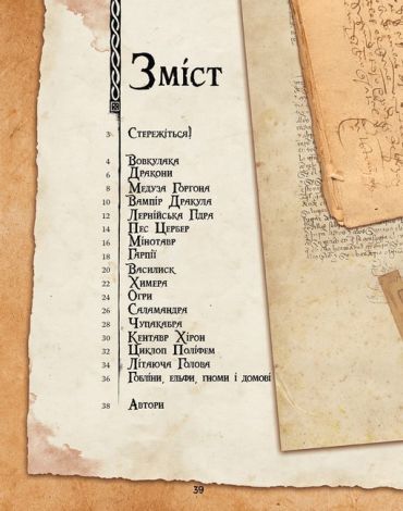 Із цієї енциклопедії ви довідаєтеся про Медузу Горгону й лернійську Гідру, яких переміг Геракл, вампіра Дракулу і Чупакабру, які полюбляють ласувату чужою кров’ю, створінь, які мають тіла людей і різноманітних тварин одночасно або ж перекидаються з людини на вовкулаку. Огиду у вас викличуть смердючі огри, триголовий пес Цербер і гарпії.