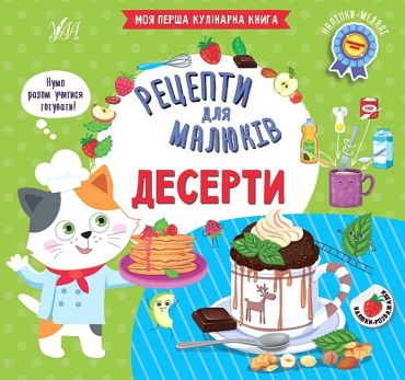 Книжка «Десерти» із серії «Рецепти для малюків» допоможе дитині навчитися готувати перші солодкі кулінарні шедеври. У цьому виданні з урахуванням вікових можливостей дитини підібрано рецепти смачних і корисних страв: перелік інгредієнтів, покрокова інструкція з приготування та дбайливі поради від шеф-кухаря. Стимулом для роботи з рецептами стануть наліпки-медалі, а розважальним бонусом — наліпки смаколиків. Книжка буде гарним подарунком і допоможе організувати цікаве й корисне дозвілля для дитини.