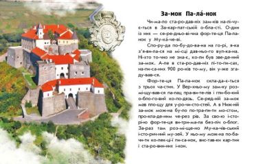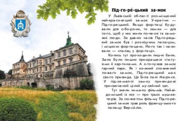 У цій книжці з серії "Чи-та-ю про Україну" зібрані короткі оповідання, які познайомлять маленьких читачів, що тільки навчаються читати, з замками та фортецями нашої України. Для вибудови правильного ритму та розподілу дихання усі слова в текстах поділені на склади. Чудові реалістичні картинки доповнять враження від текстів. За допомогою текстів та ілюстрацій малюк не тільки здобуде навичок читання, а й познайомиться з рідним краєм.