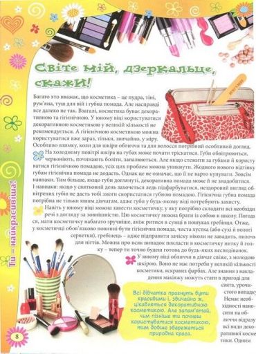 На сторінках книги ти знайдеш секрети краси і здоров'я. Навчишся правильно доглядати за своєю зовнішністю, за шкірою і волоссям, зберігати хорошу фізичну форму, а також стильно одягатися і бути самою привабливою і чарівною.