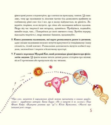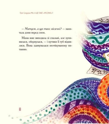 Книга «Ма, а що таке “місячні”?» написана у легкій формі діалогу між мамою та донькою і стане у пригоді для першого знайомства із темою місячних. Книга допоможе мамі, виховательці або вчительці правдиво, але й турботливо розповісти дівчаткам 5–10 років про місячні.